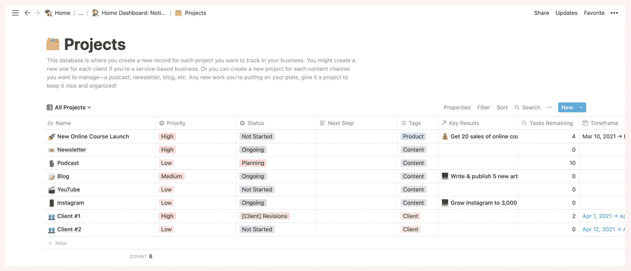 This database consists of any projects that we want to track for our business(es). This could range from launching a new course, tracking an ongoing marketing channel like Podcasts, to managing your Clients, etc.