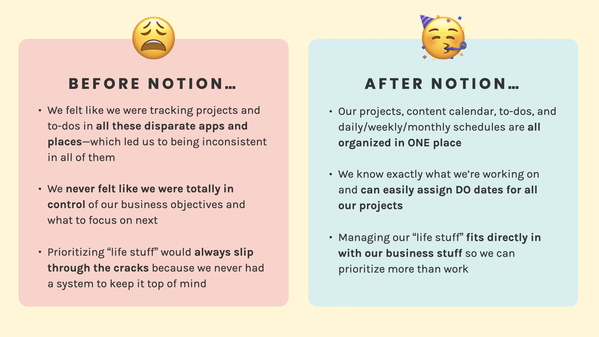 The final thing to remember: If your life and business have felt disorganized in the past, we’re with you! This system in Notion has really helped us get a stronghold on everything that’s important for us to focus on.