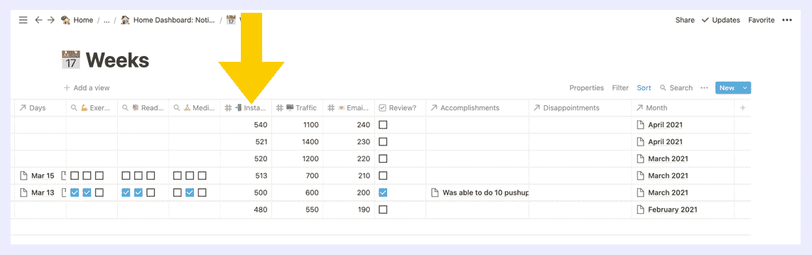 The properties for the Weeks database are a little bit different because it rolls up or aggregates the data you’ve tracked in your Daily Tracking database.