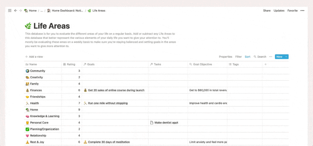 In order to cultivate each Life Area, we’ve created a relation property that is linked to the Goal Tracker database (more on this below) so we can set goals for each area of our life.