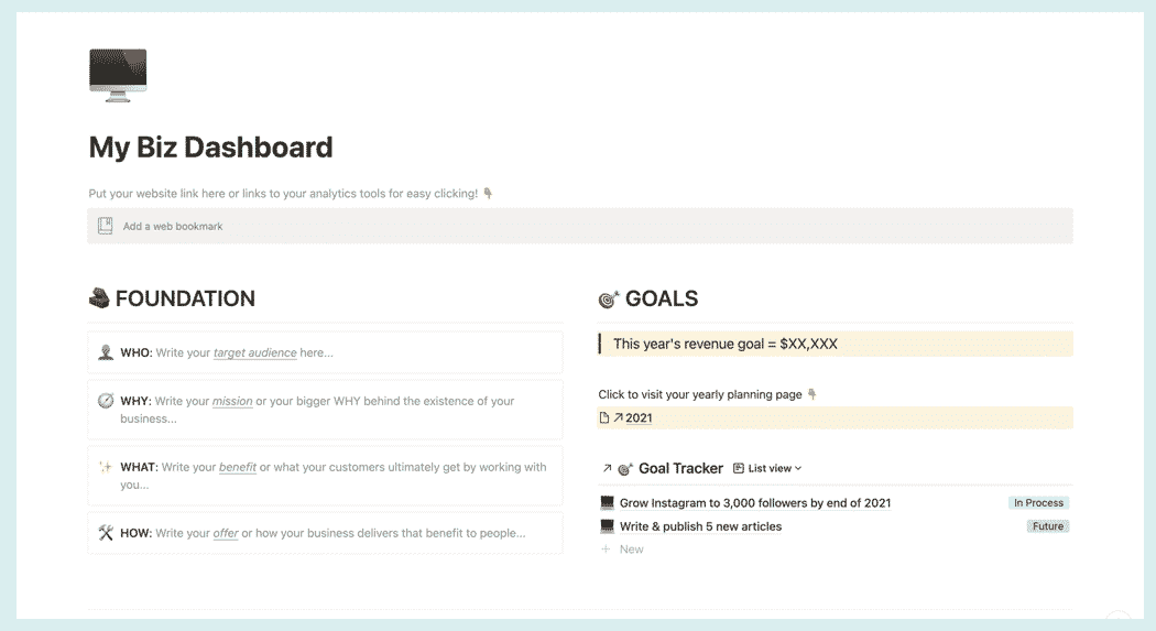 The Biz Dashboard is a page where you can see your business at-a-glance. Think of it as a living and breathing page of where you can implement the things you’re learning for your business.