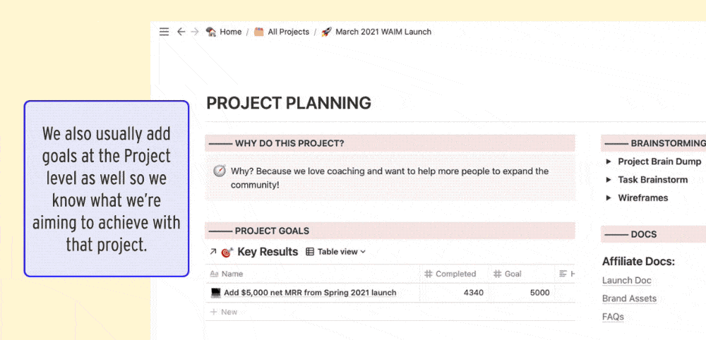 👉👉 For example: at the beginning of Q1, we set up projects for our January Flash Sale and Spring Enrollment Launch, and when we finally decided on the Notion Starter Pack as our spring “product,” we turned that into a project as well.