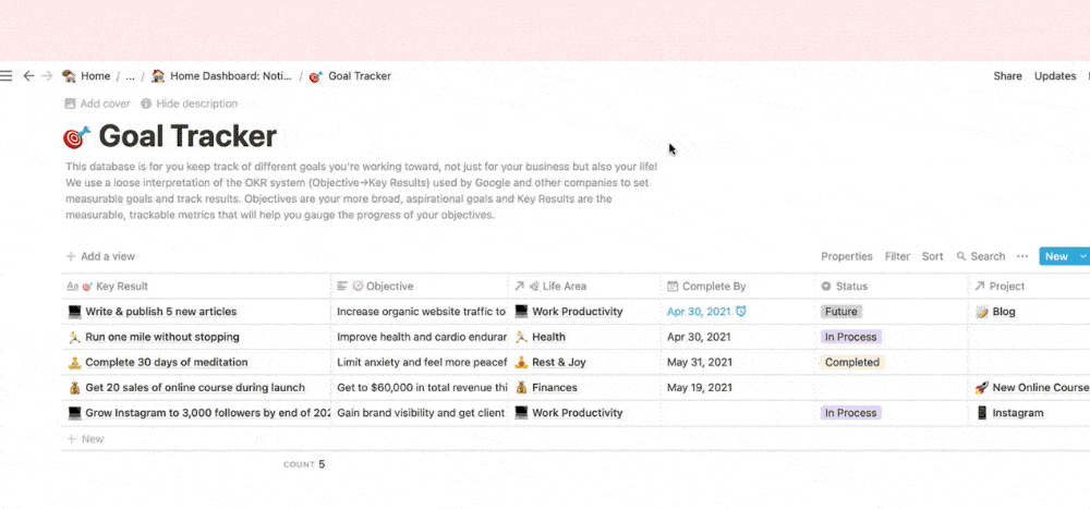Each goal is connected to a Life Area and to Projects (if applicable) using relation properties. We also have a date property to take note of when we want the goal to be completed.