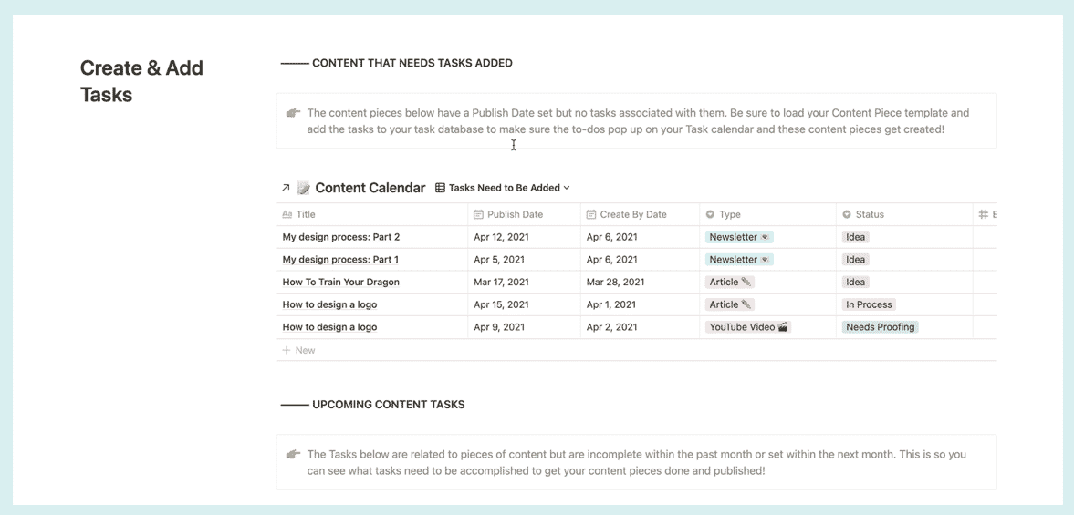 Once we’ve added our publishing dates, we go to this section to create tasks related to each content piece.