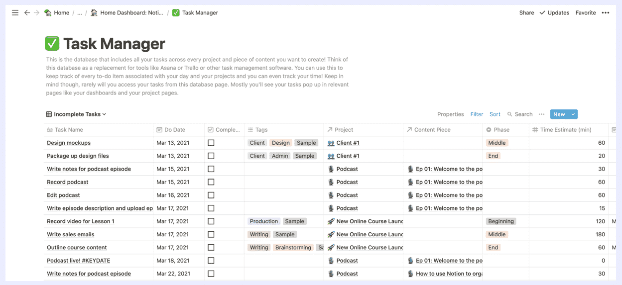 When we make a new project, we load our New Project template, and brainstorm tasks. We pull those into our Tasks database, and we’ll usually also estimate time for each task at this point too and assign a “Do Date”